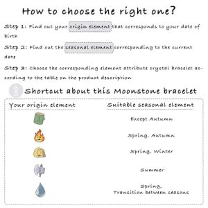 - Crystal Energy – Every crystal bracelet is designed based on the Five Elements and has different energy properties. Follow the table on the product description page, find your correct one in the corresponding season!